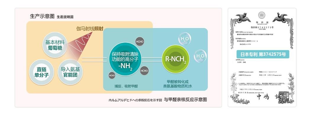 荃芬采用的是日本專利(專利第3742575號)氨基除甲醛解決方案。產(chǎn)品基本原料是葡萄糖等安全物質(zhì),原料經(jīng)過伽馬射線照射,生成穩(wěn)定的氨基高分子聚合物,捕捉、吸附空氣中的甲醛,并與其反應(yīng)生成類氨基酸物質(zhì)與氣態(tài)水。